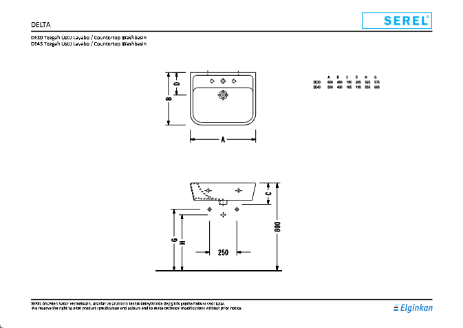 E.C.A.-SEREL DE30 Delta Tezgah Üstü Lavabo 60x48cm