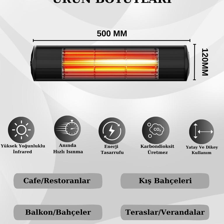 Bu ısıtıcının ince ve şık tasarımı sayesinde bağlantılar dayanıklı alüminyum mahfazasında saklıdır ve koruma türü IP65 ile tüm hava durumlarına karşı dayanıklıdır. Sağlam tasarımı sayesinde su, nem ve toz bu cihaza çok zor ulaşır. Bu IR ısıtıcılar üstü kapalı olmayan balkonlarda ve teraslarda ideal ısı kaynağı olarak işleme geçirilebilir, çünkü her yönden yağmura karşı dayanıklıdır.